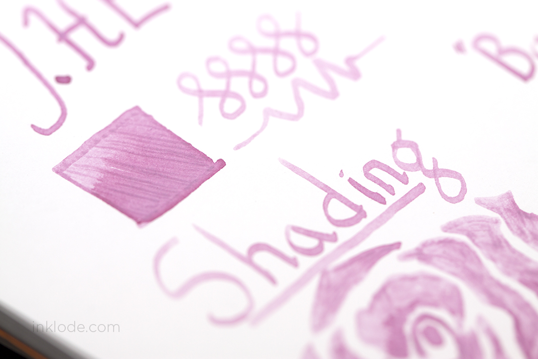 Red Dragon is a relatively well-behaved ink with some barely visible feathering when flexed on Rhodia paper. No bleeding with normal writing, even on the copy paper I did a quick test on. The shading is on the subtle side, but becomes quite noticeable in brighter light. I never had any flow issues with the ink, and it cleaned out of my pens just fine. To me, this ink has a somewhat similar feel to its brother, Diamine Oxblood, but with far less brown mixed in. Overall, Diamine Red Dragon is a really nice red that would be well suited for anything from drawing to personal writing!